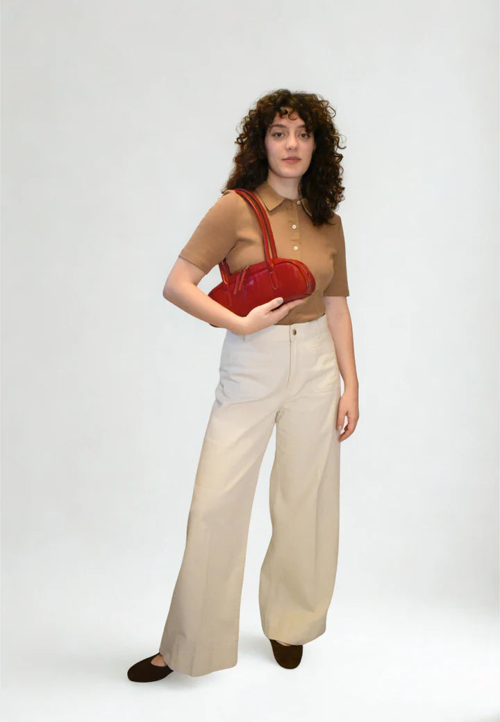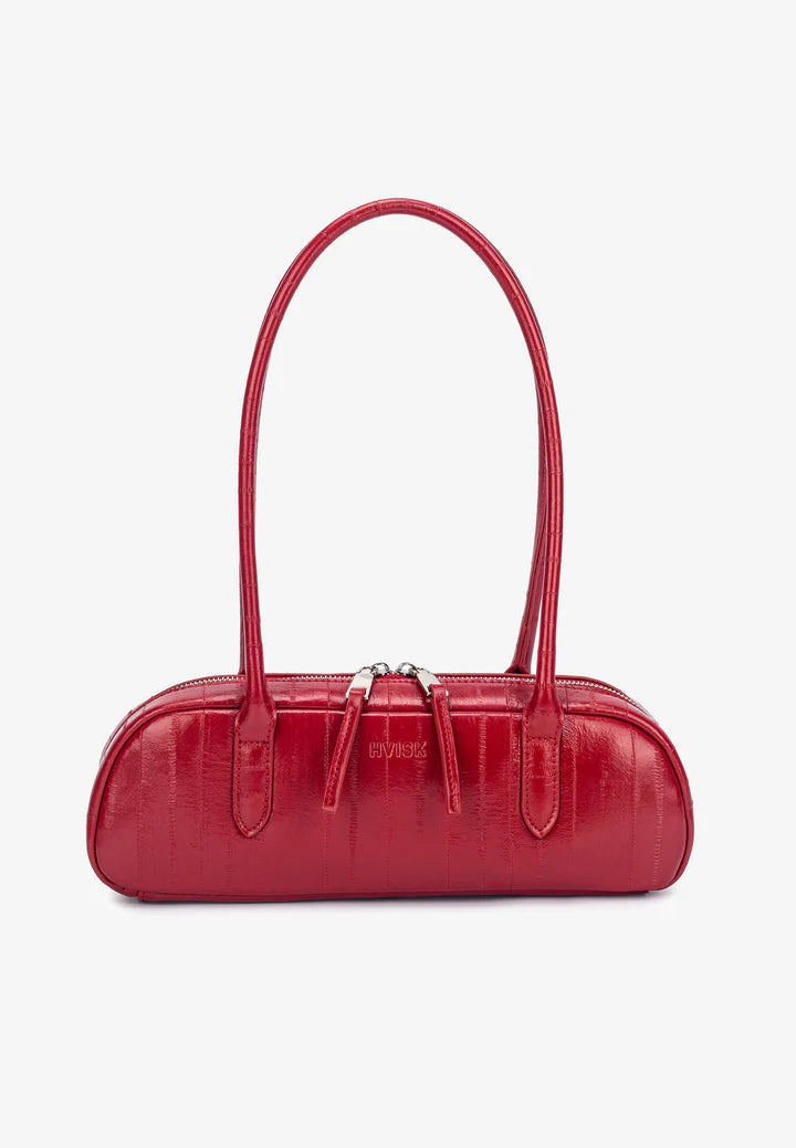 Petit sac à bandoulière avec longues poignées et fermeture à glissière. Le sac contient un compartiment principal et un compartiment intérieur.